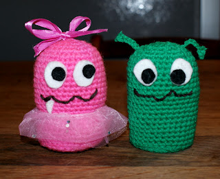 There are many patterns online but I had a huge problem following them and in the end I gave up and made up my own simply based on the style of a hat I made for my daughter last year. Not bad really for a first attempt, I have tried to give the little monsters a character matching one of the children's interests. A little ballerina and an alien, I had plans for more things but totally ran out of time.